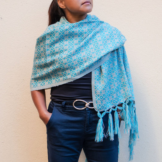 Utforsk vårt sjal og skjerf, prydet med et fantastisk mønster og en palett av farger som garantert vil vekke nysgjerrigheten hos alle rundt deg.